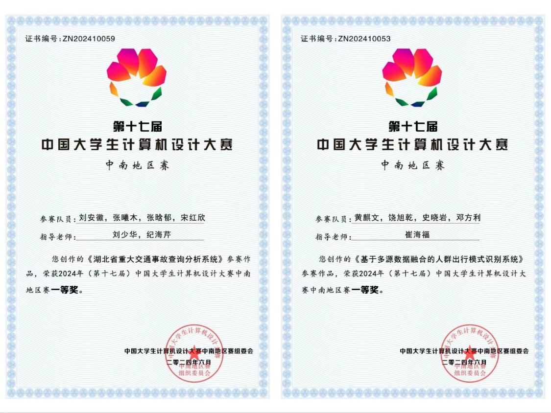 8名同学在刘少华老师的带领下前往济南决赛区-山东大学(威海校区)参加2024年(第17届)中国大学生计算机设计大赛(软件应用与开发)决赛。经过激烈的角逐,由崔海福老师指导的作品《基于多源数据的人群出行模式识别系统》和刘少华老师指导的作品《湖北省重大交通事故查询分析系统》获得中国大学生计算机设计大赛三等奖。