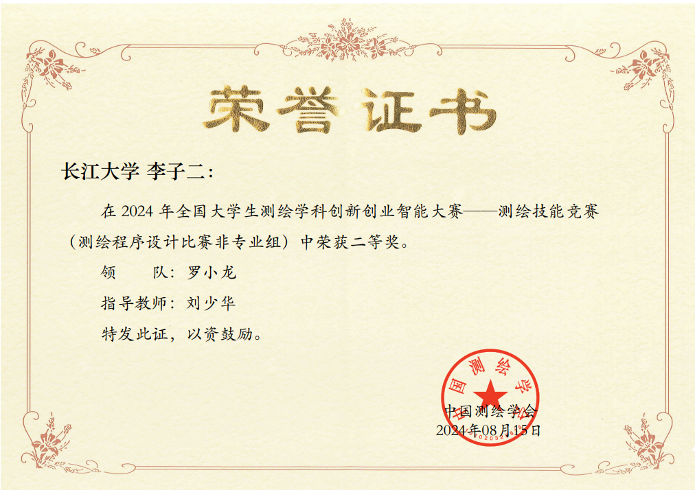 李子二和李征在刘少华老师的悉心指导下,参加了测绘技能竞赛中的测绘程序设计比赛。经过激烈的角逐,他们凭借出色的专业技能和创新能力,最终取得了国家级二等奖的优异成绩。