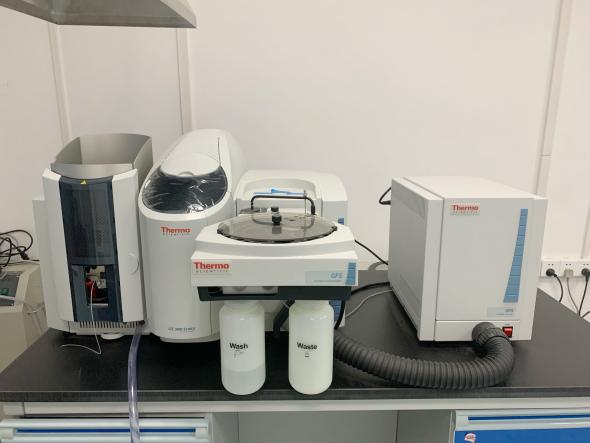 主量元素分析实验室 一、实验室简介 本实验室隶属于嘟嘟成人网 实验中心。主要功能是:(1)岩石、水系沉积物、土壤等样品中主量、痕量元素测定;(2)环境水样中主要阳离子、重金属等浓度测定;(3)固体材料中无机金属元素含量测定。实验室位于实验楼B403。 二、仪器设备 电感耦合等离子发射光谱仪 原子吸收光谱仪 仪器设备:电感耦合等离子发射光谱仪)&原子吸收光谱仪 品 牌:美国ThermoFisher 主要参数: *分辨率 0.005nm~200 nm*线性动态范围 1010*波长范围 165-1100nm,任意谱线 *短期稳定性 RSD% < 0.5*长期稳定性 RSD% < 2.0 ( 4 小时) *Icp-Aes分析速度 73个元素/分钟 三、实验室责任人 李佳 联系电话:13693603527 四、实验预约流程 需与实验室责任人确定样品类型、数量后,下载填写“分析测试申请表”或在平台处系统中预约,在开展实验当天提交纸质申请表。