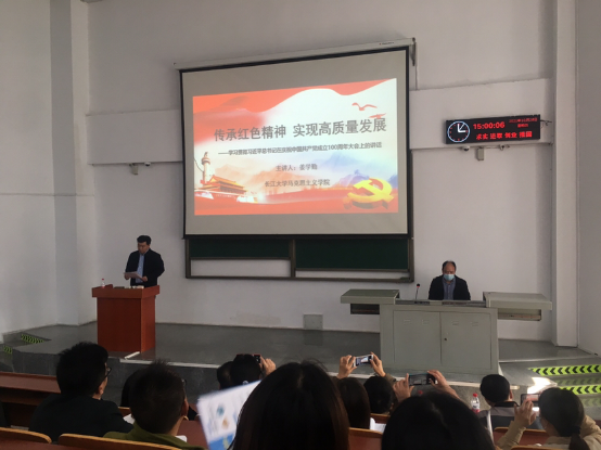 马克思主义学院院长姜学勤教授主讲,主题为“传承红色精神、实现高质量发展-学习贯彻习近平总书记在庆祝中国共产党成立100周年大会上的讲话”。