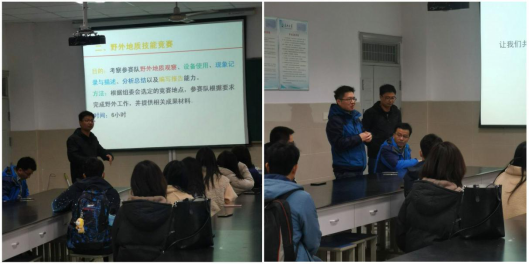 赵少卿老师向同学们详细介绍了全国大学生地质技能竞赛的内容、实施方案以及具体细节,包括地质技能综合应用、野外地质技能竞赛、地质标本鉴定等竞赛项目的训练规划,使同学们对本次竞赛有了更深入的了解并开始全面进入竞赛训练备战。随后,高达老师向同学们讲解了如何更好的备战本次竞赛,要求同学们要合理兼顾学习与准备比赛的时间,积极学习基础性知识,拓展高难度知识,培养良好的心态,这样才有利于在比赛中获得良好的成绩。