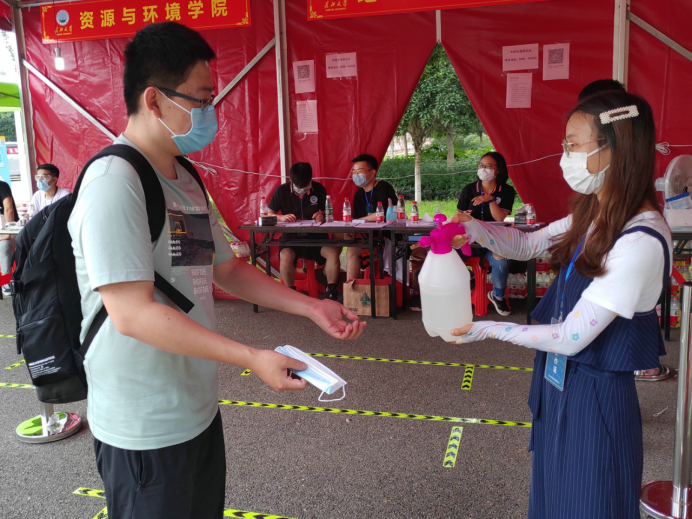 校区在地铁口安排专车接送返校学生。毕业生到校后,先在指定报到点消毒、扫码、登记、进行体温检测,同时领取学院精心准备的“防疫健康包”,里面装有一枚精致的校徽、口罩、手套、体温计、毕业温馨提示,学校还为每位毕业生发放2天的餐券,用于换购美味的毕业套餐。