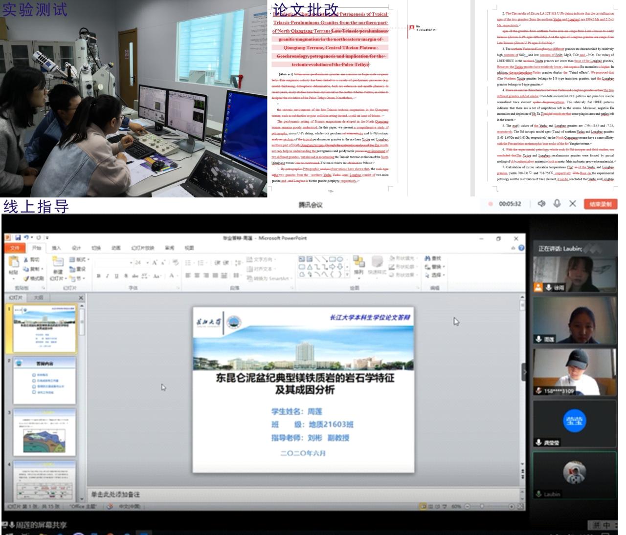的青年教师刘彬副教授在非常重视毕业生地质思维能力、科研技能和学术规范性等训练。在学生确定选题后,便有针对性地向学生提供与论文研究相关的文献,启发学生从多个不同角度思考科学问题,并且亲自带领和指导学生进行样品处理与上机测试。为解决疫情期间无法进行面对面指导这一问题,刘彬老师还利用腾讯会议和QQ等社交软件开展线上指导与 “一对一”实时交流,及时解答学生的论文问题,引导和鼓励学生们在疫情期间调节各种负面情绪、不畏困难、静心学习,督促学生高效地完成论文工作的各个环节。