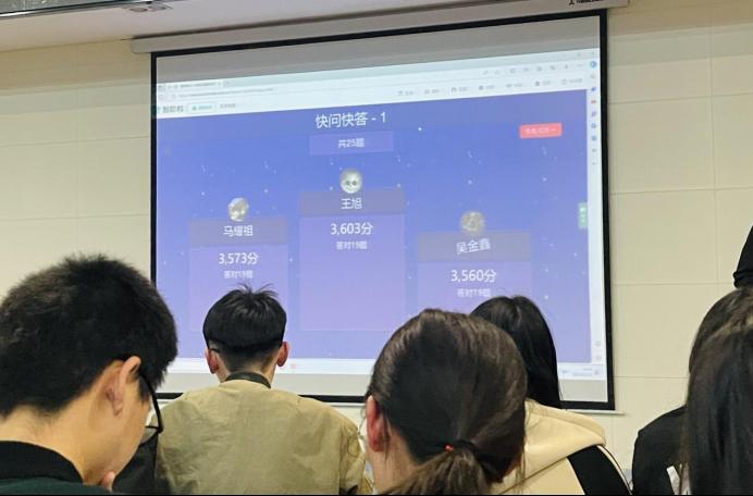 第一个快问快答环节,全体参赛选手利用手机“微助教”答题,上一题所有选手作答后系统会自动跳转到下一题并提示每人的成绩和排名,每题平均思考时间不足5秒,选手们全神贯注,屏息凝神,迅速作答,将比赛气氛推向高潮。