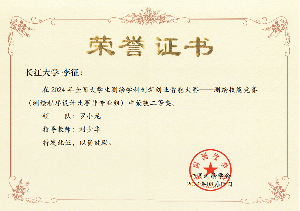 李子二和李征在刘少华老师的悉心指导下,参加了测绘技能竞赛中的测绘程序设计比赛。经过激烈的角逐,他们凭借出色的专业技能和创新能力,最终取得了国家级二等奖的优异成绩。