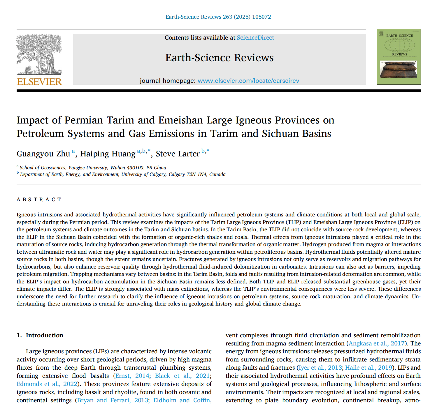 朱光有和黄海平教授在中科院一区TOP期刊《Earth-Science Reviews》(IF=10.8)发表题为“Impact of Permian Tarim and Emeishan Large Igneous Provinces on Petroleum Systems and Gas Emissions in Tarim and Sichuan Basins”的论文。