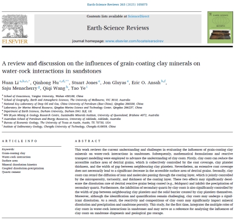 论文信息:Huan Li*, Qinhong Hu*, Stuart Jones, Jon Gluyas, Eric O. Ansah, Saju Menacherry, Qiqi Wang, Tao Ye, 2025. A review and discussion on the influences of grain-coating clay minerals on water-rock interactions in sandstones. Earth-Science Reviews 263, 105073.//doi.org/10.1016/j.earscirev.2025.105073.