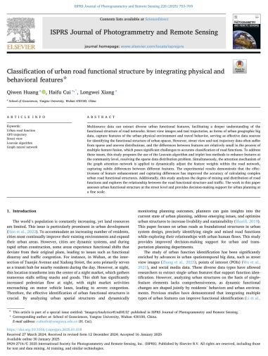 地理信息科学专业2020级学生黄麒文在中科院一区TOP期刊《ISPRS Journal of Photogrammetry and Remote Sensing》(IF=10.6)发表题为“Classification of urban road functional structure by integrating physical and behavioral features”的研究论文。嘟嘟成人网