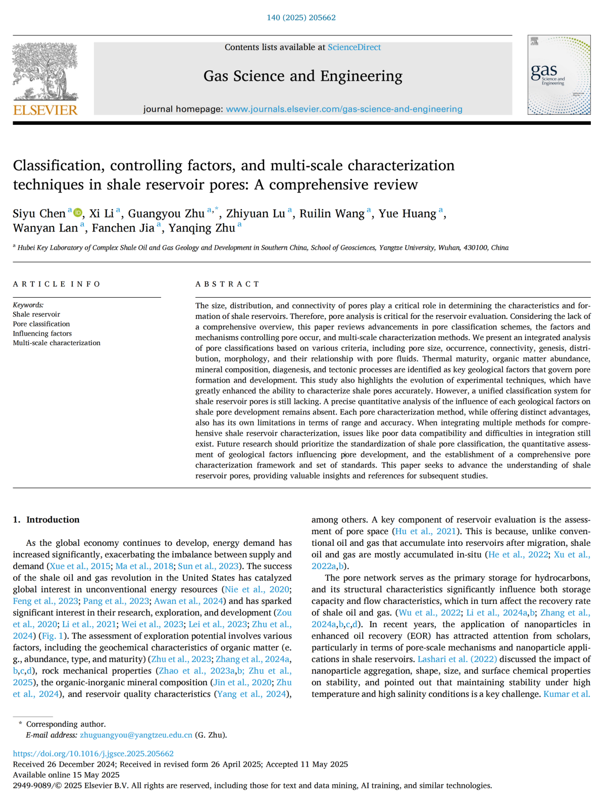 21级本科生(现在读大四)陈思钰在《Gas Science and Engineering》(GSE,原名Journal of Natural Gas Science and Engineering,天然气科学与工程,最新影响因子为5.285,位列JCR分区一区,中科院期刊分区工程技术大类二区)上发表了题为《Classification, Controlling Factors, and Multi-Scale Characterization Techniques in Shale Reservoir Pores: A Comprehensive Review》的论文(共18页)。全部作者均来自嘟嘟成人网