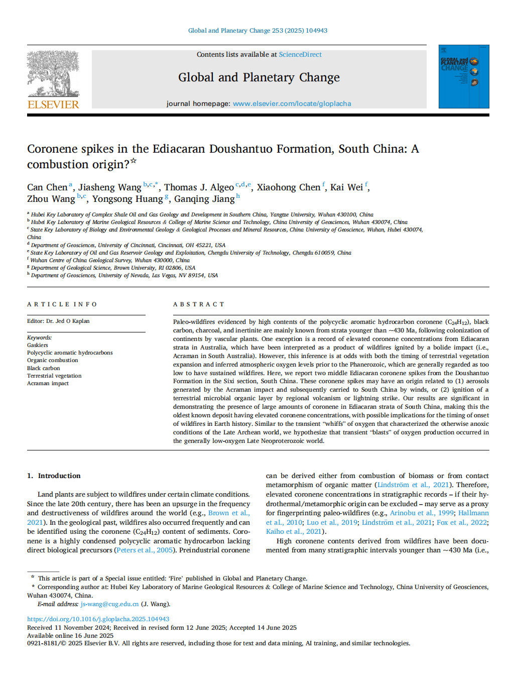 特任教授陈粲在《Global and Planetary Change》上发表题为“Coronene spikes in the Ediacaran Doushantuo Formation, South China: A combustion origin?”的论文,嘟嘟成人网