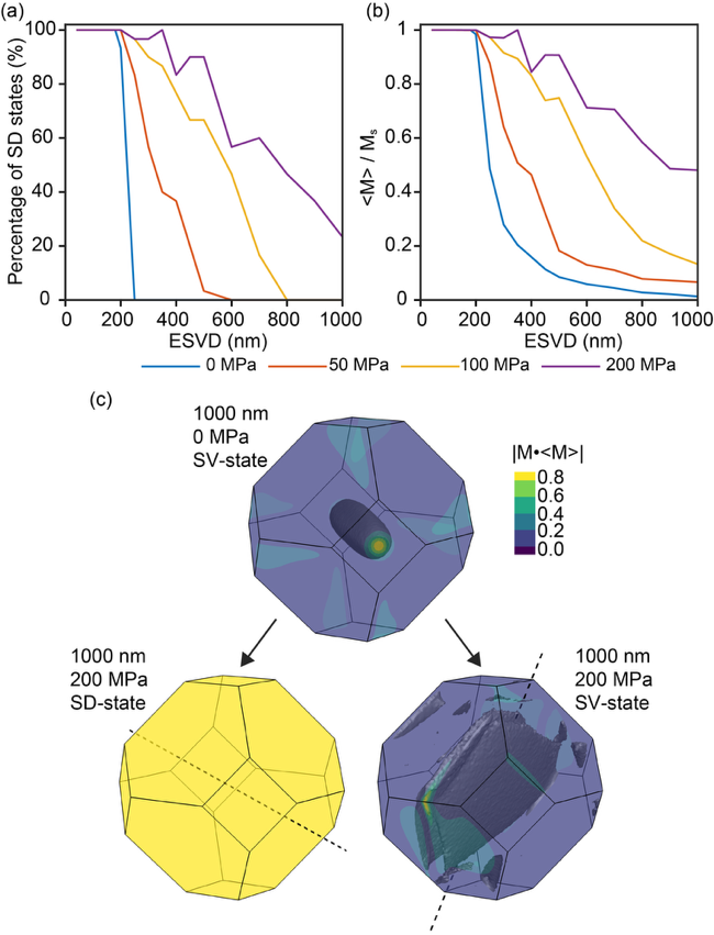 图3 微磁模拟应力对磁畴状态的影响。结果显示应力引起磁畴状态的转变可显著提高磁性颗粒记录剩磁的强度和稳定性。