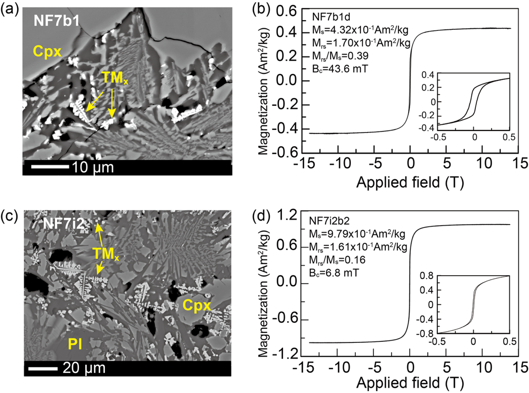图1 NF7样品的电镜照片及14 T高场岩石磁学特征