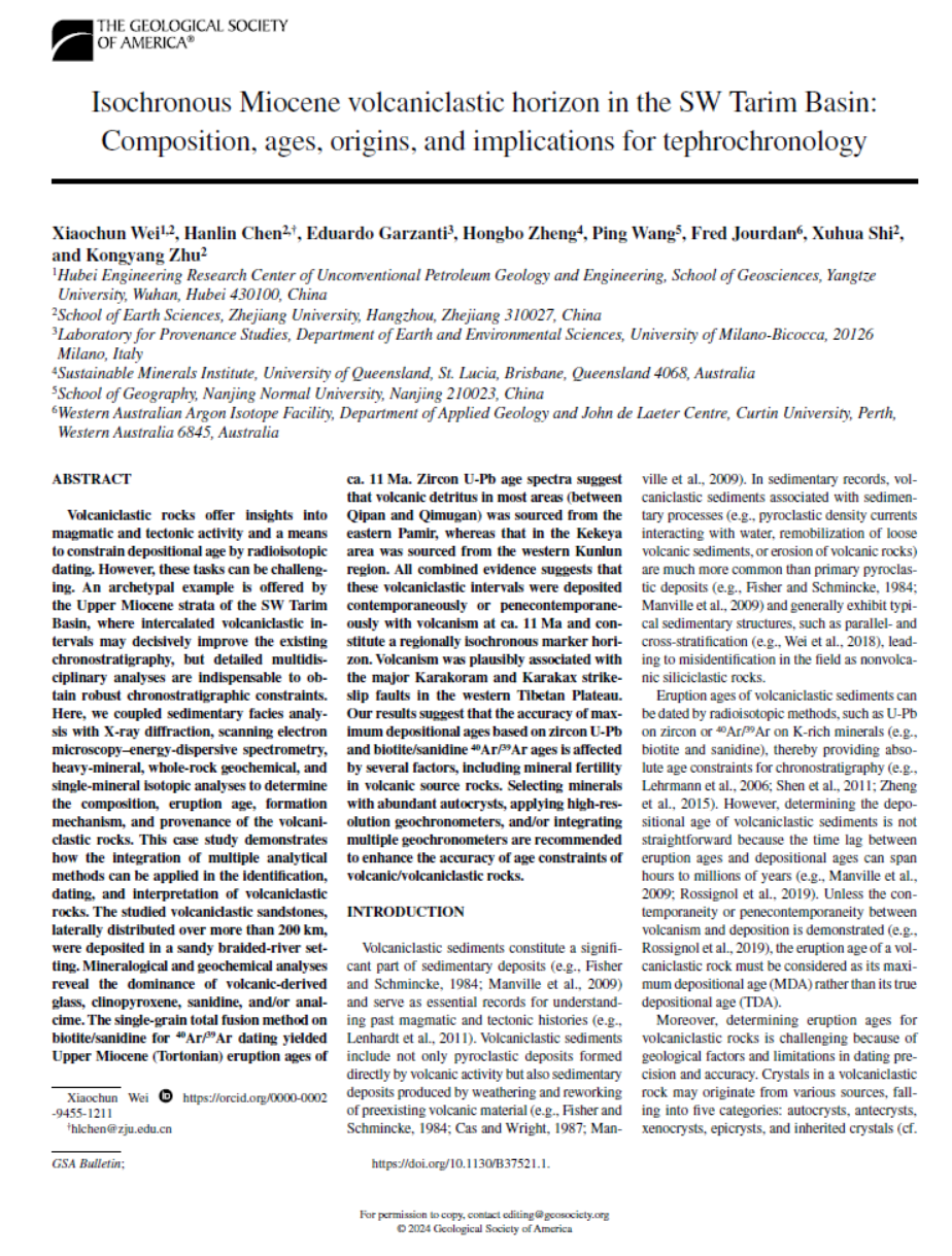 石油系特任副教授魏晓椿在地学综合期刊《GSABulletin》上发表题为“Isochronous Miocene volcaniclastic horizon in the SW Tarim Basin: Composition, ages, origins, and implications for tephrochronology”的研究论文(图1)。在塔里木盆地西南缘(塔西南)识别出距今约1100万年的大规模等时火山碎屑沉积层,为破解该区域新生界缺乏可靠年代框架的难题奠定了重要基础。嘟嘟成人网