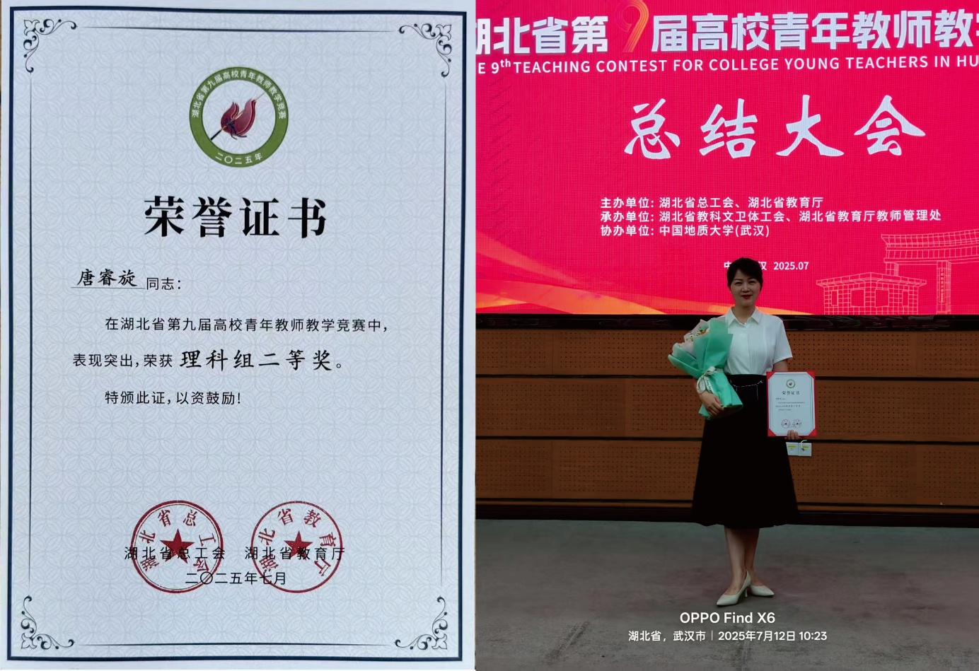 高贤君老师和唐睿旋老师分别入围两项重要教学竞赛的现场决赛。5月24日至25日,第五届湖北省高校教师教学创新大赛决赛在武汉理工大学举行,高贤君老师课程团队获得新工科副高组二等奖。7月10日至11日,湖北省第九届高校青年教师教学竞赛在中国地质大学(武汉)举行,唐睿旋老师获理科组二等奖。