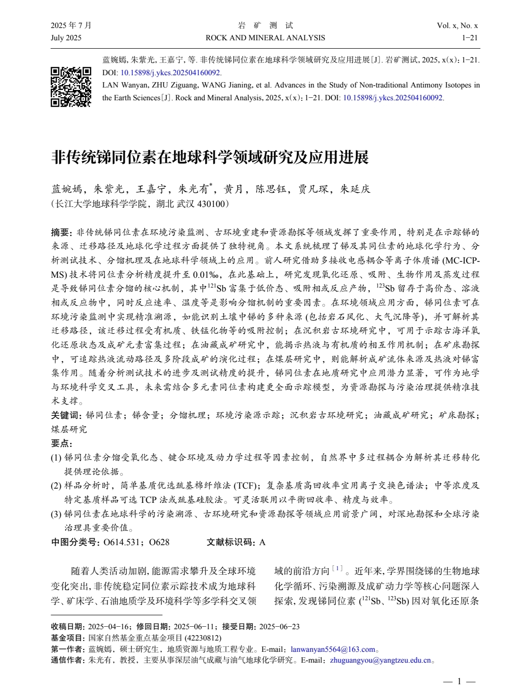 师生,其中地质资源专业22102班本科生蓝婉嫣为第一作者,其导师朱光有教授为通讯作者。该论文系统梳理了锑及其同位素的地球化学行为、分析测试技术、分馏机理,以及在地球科学领域的应用。