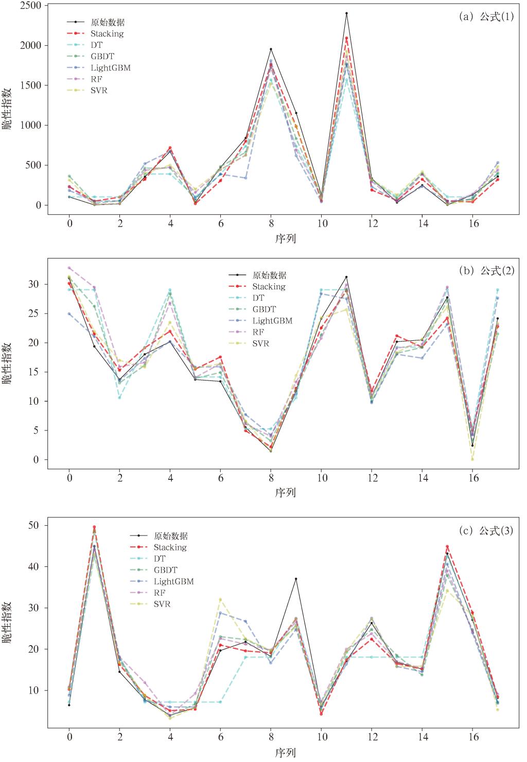 通过训练,所构建的TPE-Stacking集成模型与各个基模型相比,总体发挥相对较为稳定,不仅在正常预测时拟合较好,而且在面对异常数据波动时相较于其他模型表现着更为不错的泛化能力(图3)。经数据校验,本文构建的TPE-Stacking模型在预测脆性指数时其决定系数R2分别达到了0.967、0.950和0.937,均为各组数据最优成绩;TPE-Stacking模型预测的平均绝对误差MAE分别做到了96.08、1.662和2.059,在与其他基模型对比时相对更低。这说明本文构建的基于树结构Parzen估计器优化后的两层Stacking模型可以较为准确、可靠地预测岩石脆性指数。