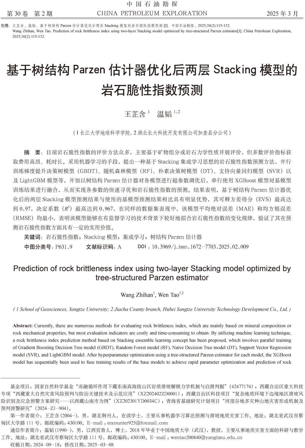 22级本科生(在读大三)王芷含在EI、核心期刊《中国石油勘探》上发表了题为《基于树结构Parzen估计器优化后两层Stacking模型的岩石脆性指数预测》的论文(图1,共18页)。全部作者均来自嘟嘟成人网