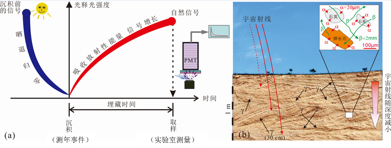 图4 沉积物释光测年基本原理示意图(a:沉积物颗粒在搬运过程中原来的释光信号因光照晒退回零,在埋藏后接受周围的放射性如α、β和γ射线的辐照;b:产生新的释光信号直到取样测量)