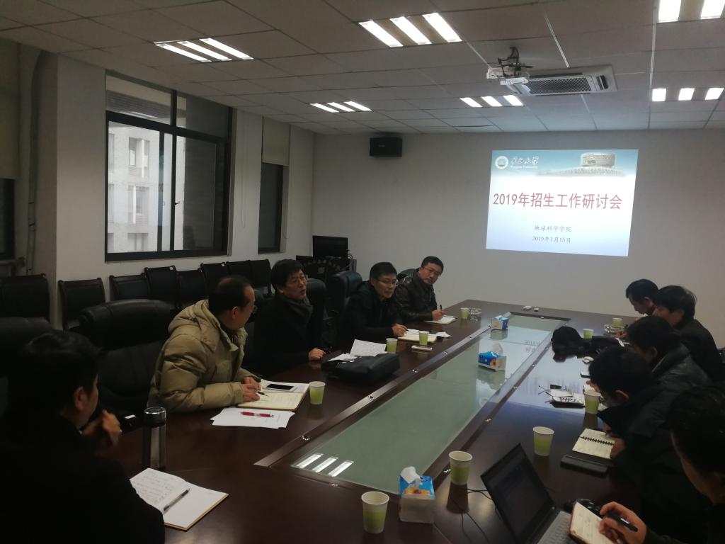 招生工作的整体情况以及当前面临的形势,并就有效创新招生宣传形式以及加强专业教育等方面提出下一步的工作举措。资源勘查工程专业负责人吴楠介绍了专业招生与就业特点,从“国家、学校、专业、协同”四个层面指出强化招生工作的重要性,提出了2019年计划招生方向及指标。地质学专业负责人肖传桃结合国家战略、双一流学科建设支撑、地矿油行业回暖、旅游行业旺盛等方面的需求提出招生分配建议。地理信息科学专业负责人何贞铭从专业特点、我校专业特色及行业发展前景等方面分析了专业招生工作的现状及发展方向。
