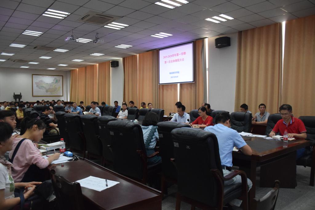 在石油科技大楼B113会议室召开本学期第一次全体教职工大会,就2019年下半年各方面工作进行部署。会议由党委书记江万哲主持。