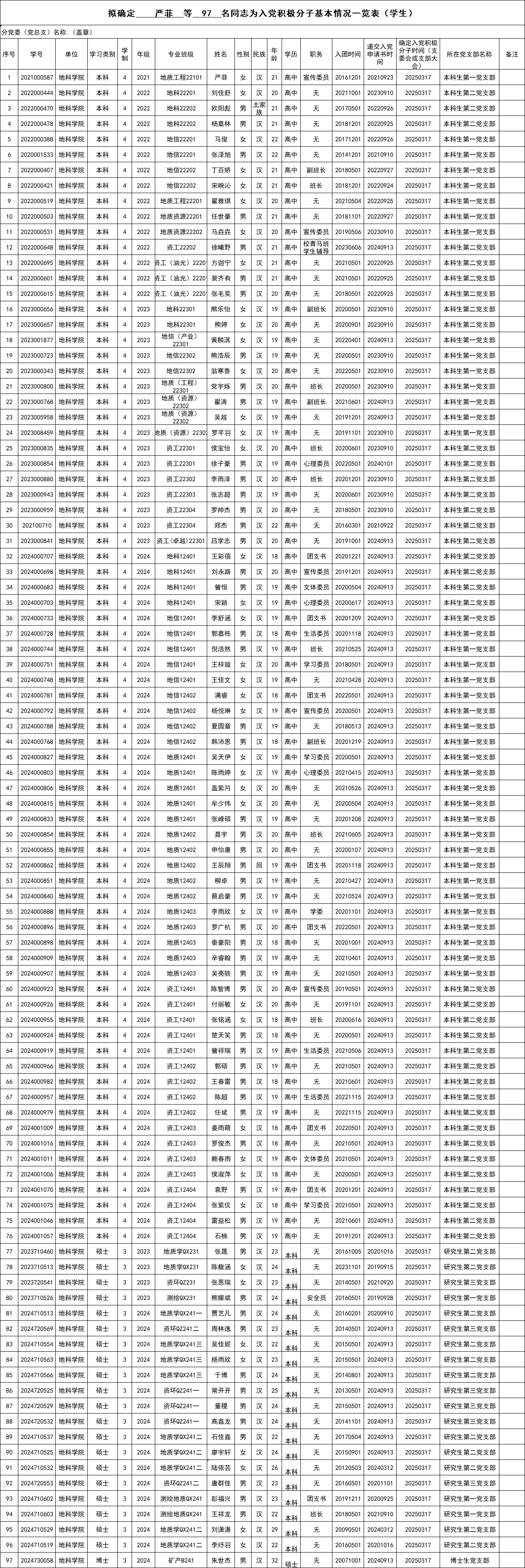 附:拟确定严菲等97名同志为入党积极分子基本情况一览表