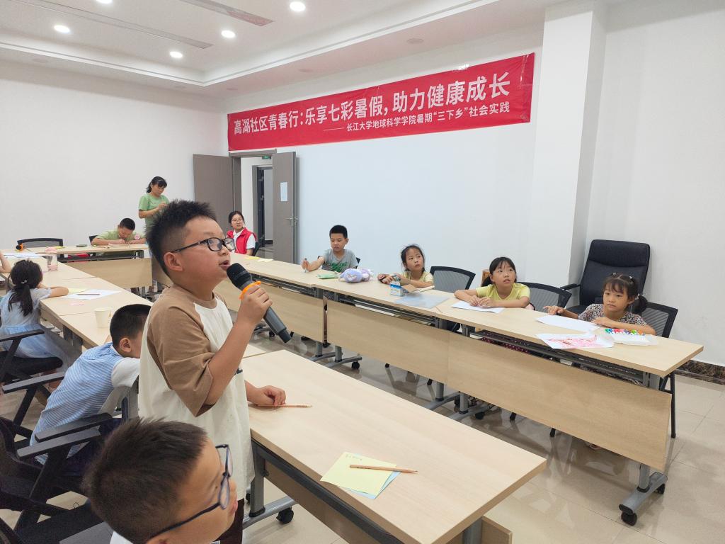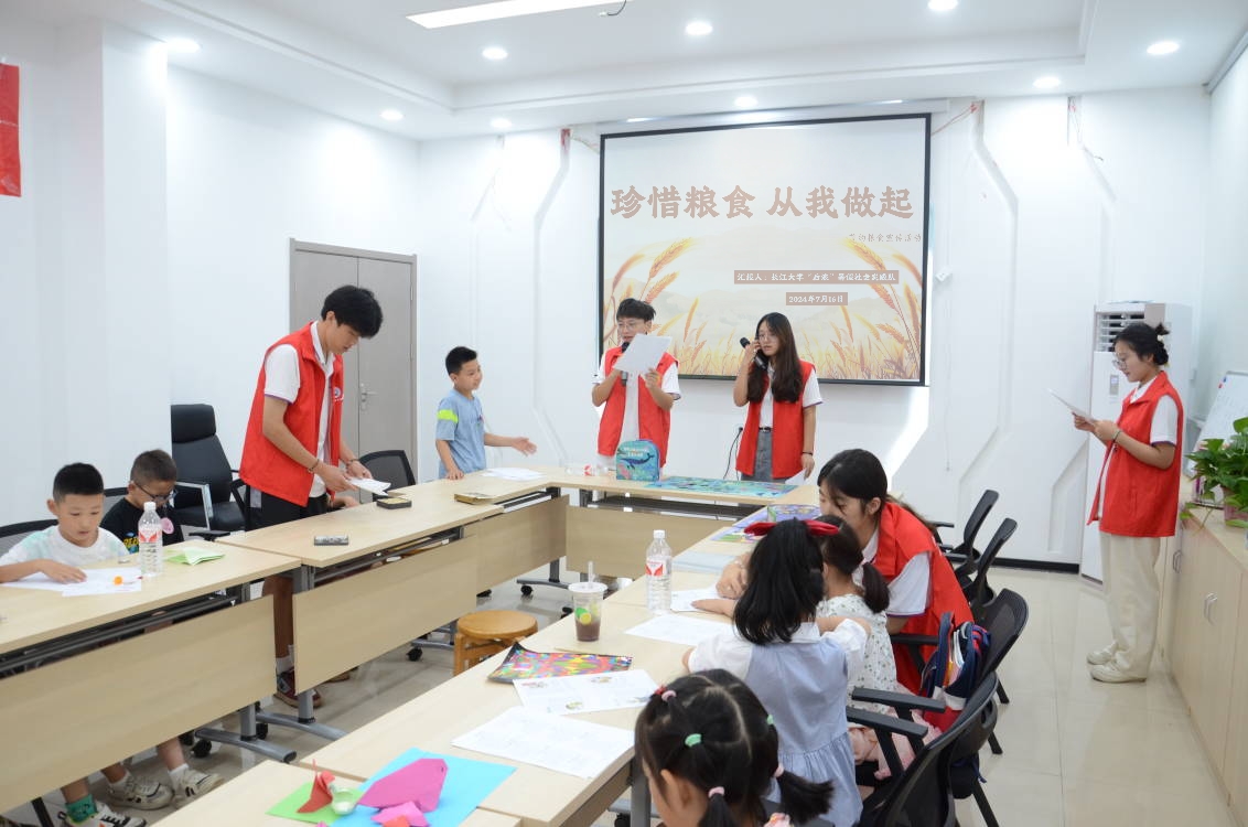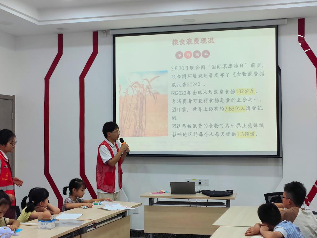 “后浪”暑期社会实践队在高湖社区“暑假学堂”为社区的孩子们开展了节约粮食讲座。