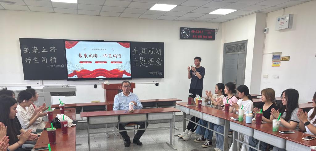 地信(产业) 22201 班在武教 A-402教室举办了主题为“师生之路 未来同行”的“导师进班会”活动。李功权教授通过深度解析GIS学科前沿与行业趋势,助力学生锚定发展方向。活动由地信(产业) 22201 班班长齐缘主持。
