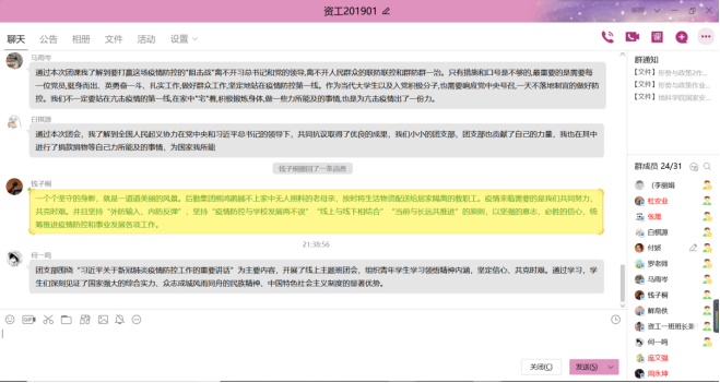 最后,付娇同学对本次团会进行了总结,她说道:“这次疫情可能会给历史留下一道辙痕,但更能载入史册的,是中国人民团结一致,共克时艰的英勇乐观精神!无数逆行者身上彰显出的英雄气概再度诠释了中华民族的伟大!作为青年学生的我们,要以他们为标杆,为中华民族的伟大复兴,奉献自己的力量。”至此此次线上主题团会活动圆满结束。