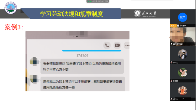 就业信息网”政策法规专栏,引导学生充分挖掘并利用资源了解国家各部委、各省市等制定的吸引人才、促进就业创业的政策。此外,会上还利用前期学生线上咨询的案例对学生在就业过程中遇到的具体问题进行分析和引导,避免学生在后面进入相同的误区。