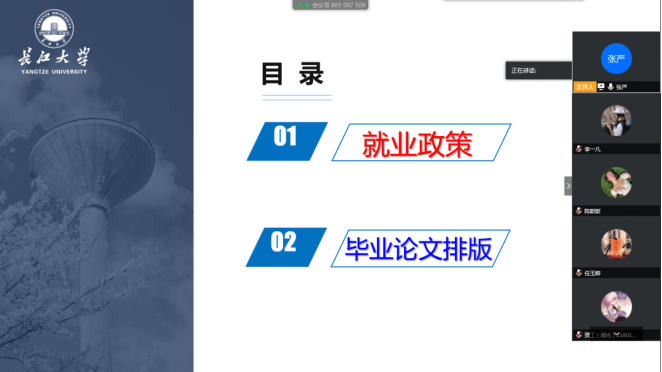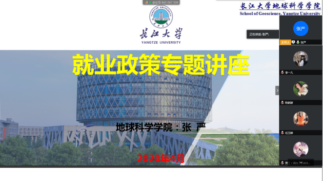 利用腾讯会议平台举行了大学生就业政策解读专题讲座,2017级本科生以及部分2020届研究生和本科生参加了讲座。讲座由辅导员张严老师主持。