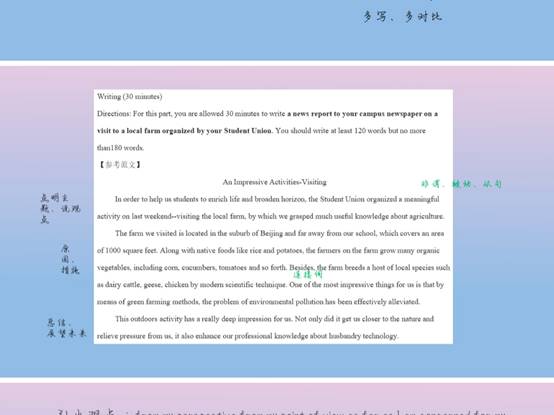 本次交流会目的在于提高同学们在英语四级考试中作文及翻译部分的得分。首先,来自资工21803班的余舜禹同学从四级分值、写作技巧、翻译专精和个人考试感想四个方面为同学们讲解了四级考试中需要注意的问题。他强调在英语四级考试中,分数占比最大的是听力和阅读,但是翻译和写作却是比较容易得分的部分。同时他也为同学们分享了自己的学习方法,即背诵范文,学会灵活运用。例如:可以认真学习范文中的一些句式和比较精彩的表达,然后将其运用到自己的文章中。接着,他又指出同学们在翻译中经常出现的“翻译在最后写”、“时间不够用”、“对于一些主题,发挥空间有限”、“忘记单词或者短语”以及“中国式英语”等一系列问题。针对这些问题,他指出平日必须多累积,经常系统性的做一些模拟测试。最后,他着重强调备考的重要性,希望同学们坚决做到不裸考,争取获得满意的成绩。