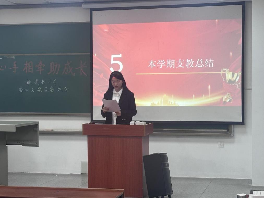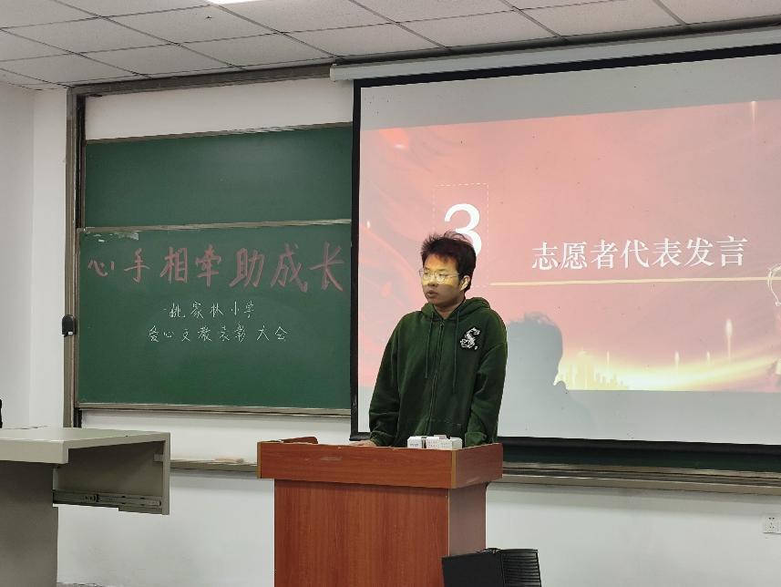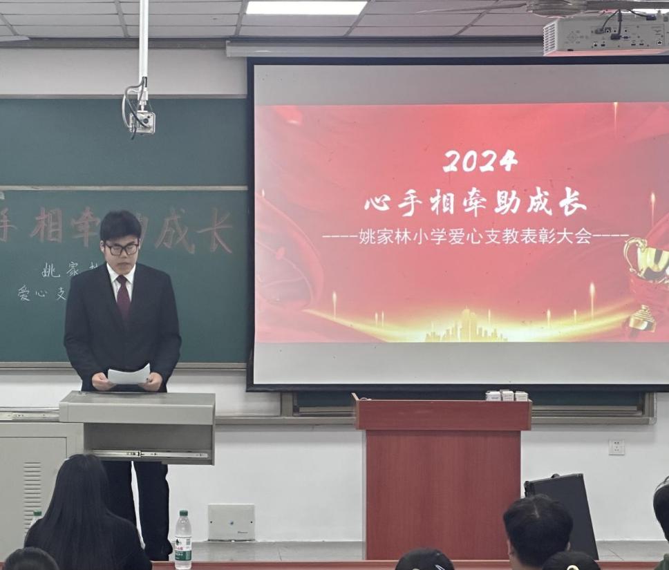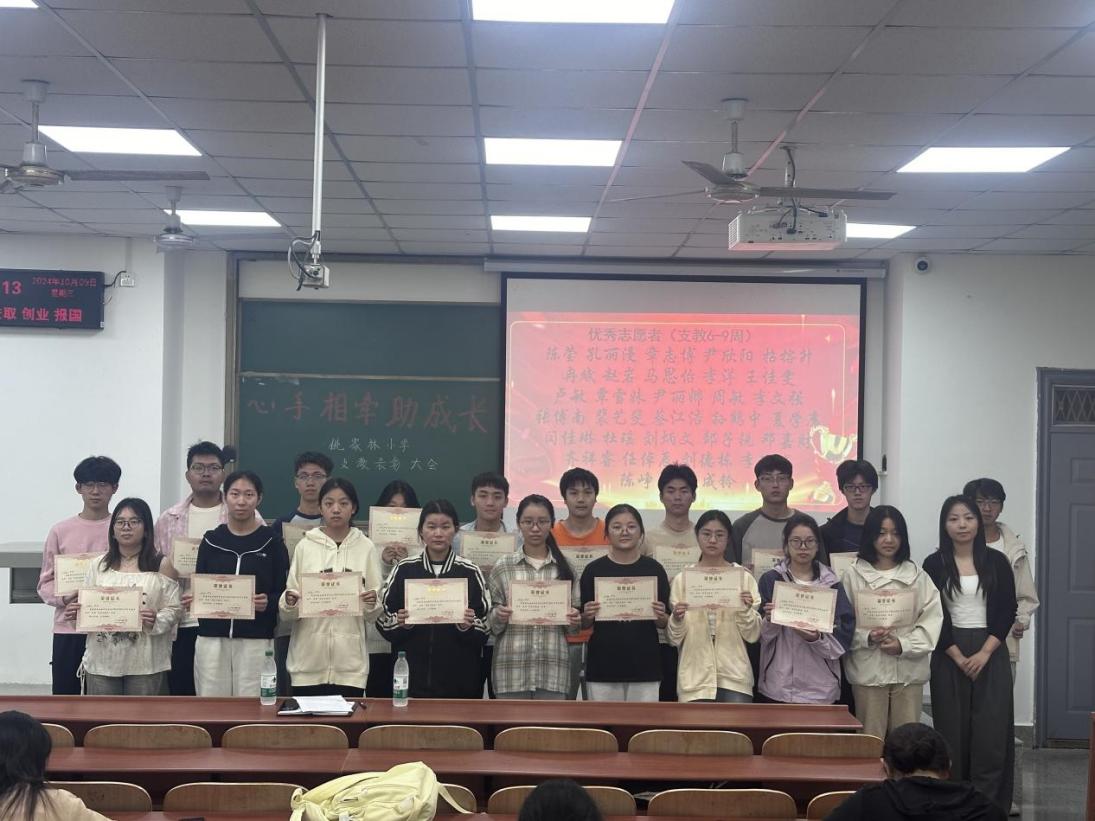 团委学生会志愿服务部于10月9日中午12:00,在b106举行了“心手相牵助成长”姚家林小学爱心支教活动的表彰大会,对2023-2024学年参与活动的志愿者进行了表彰,为他们的爱心和坚持点赞。