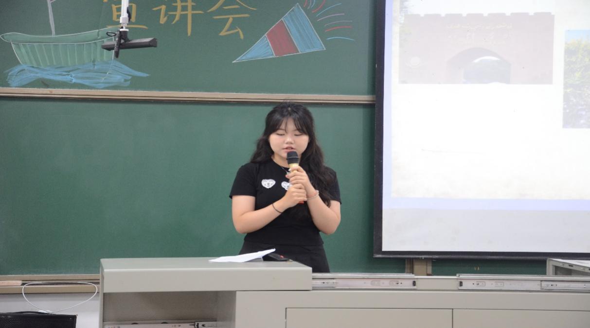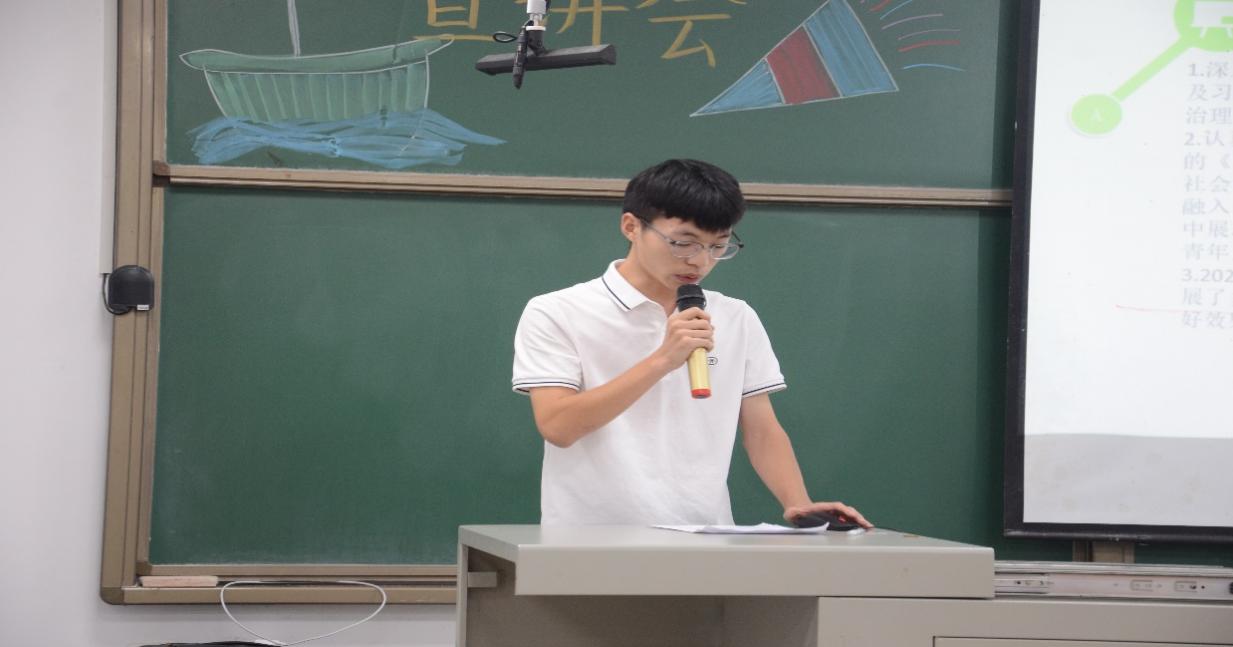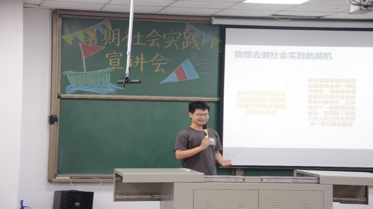 “后浪”暑期社会实践队党宇烁同学分享了他参加学院团委联合蔡甸区高湖社区开展的“暑假学堂”系列志愿服务活动。在本次活动中,志愿队通过开展地质科普讲座、暑期安全科普和心理健康教育等一系列志愿活动,同时走访社区困难家庭,为社区发展注入青年活力,展现了青年责任与担当。最后他鼓励我们积极投身社会实践中,这对我们和小朋友们的成长以及未来的发展都具有重要意义。