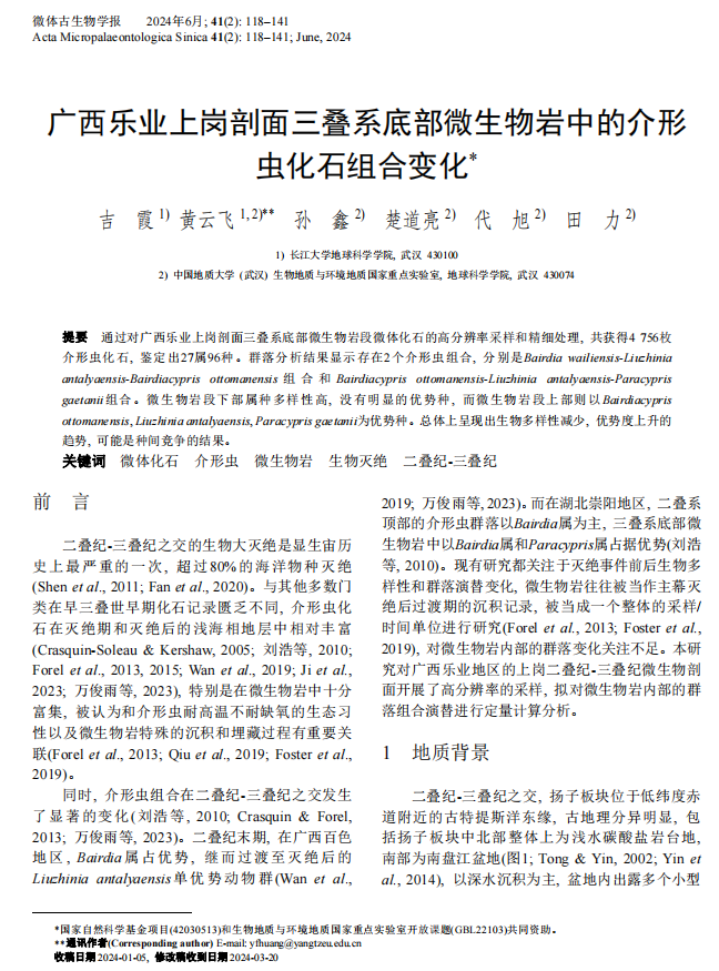 黄云飞教授团队长期从事古-中生代之交重大地质转折期生物灭绝与生物复苏方面的研究,团队成员吉霞在古生物学领域核心期刊《微体古生物学报》上发表题为“广西乐业上岗剖面三叠系底部微生物岩中的介形虫化石组合变化”的研究论文。嘟嘟成人网