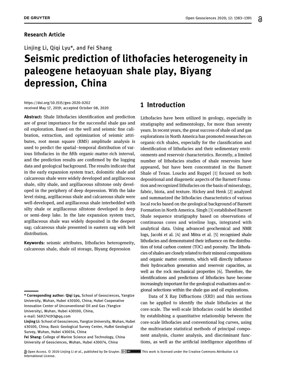 地质系胡明毅教授团队长期从事储层沉积学及页岩气资源评价等方向的研究。团队成员李琳静博士在期刊《Open Geosciences》上发表题为《Seismic prediction of lithofacies heterogeneity inpaleogene hetaoyuan shale play, Biyangdepression, China》的研究论文,嘟嘟成人网
