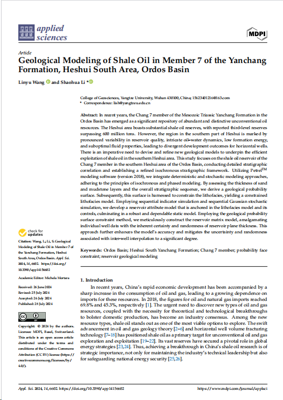 李少华教授团队长期从事储层表征与建模的研究,团队成员王麟宇在环境与地球科学领域主流期刊《Applied Sciences》上发表题为“Geological Modeling of Shale Oil in Member 7 of the YanchangFormation,Heshui South Area, Ordos Basin”的研究论文。