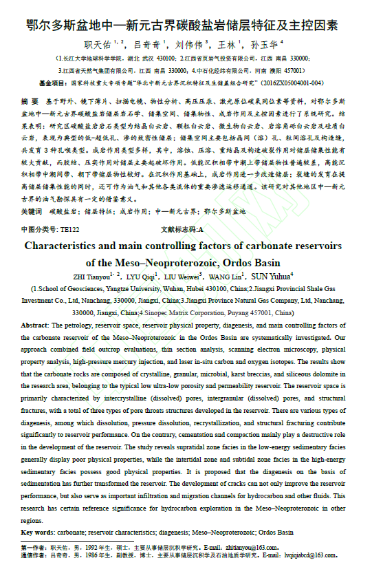 研究生职天佑在北大核心期刊《断块油气田》上发表题为“鄂尔多斯盆地中—新元古界碳酸盐岩储层特征及主控因素”的研究论文。嘟嘟成人网