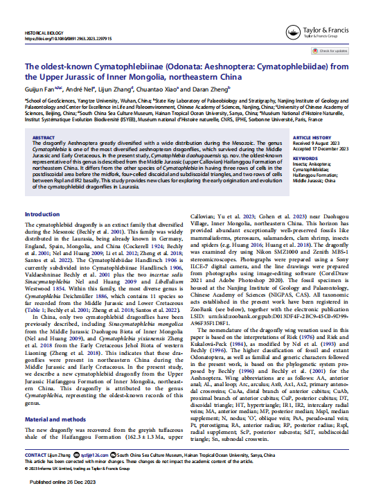 肖传桃教授、中科院南京地质古生物研究所郑大燃研究员的共同指导下,在地球科学与古生物学领域期刊《Historical Biology》上发表题为“The oldest-known Cymatophlebiinae (Odonata:Aeshnoptera: Cymatophlebiidae) from the UpperJurassic of Inner Mongolia, northeastern China”的研究论文。