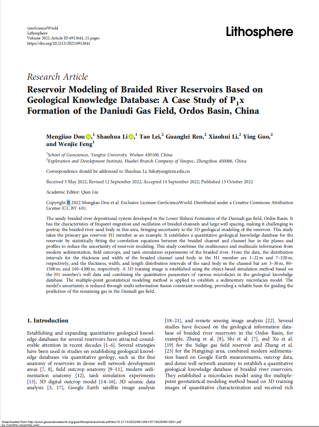 博士生窦梦皎在《Lithosphere》上发表题为“Reservoir Modeling of Braided River Reservoirs Based onGeological Knowledge Database: A Case Study of P1xFormation of the Daniudi Gas Field, Ordos Basin, China”的研究论文。嘟嘟成人网