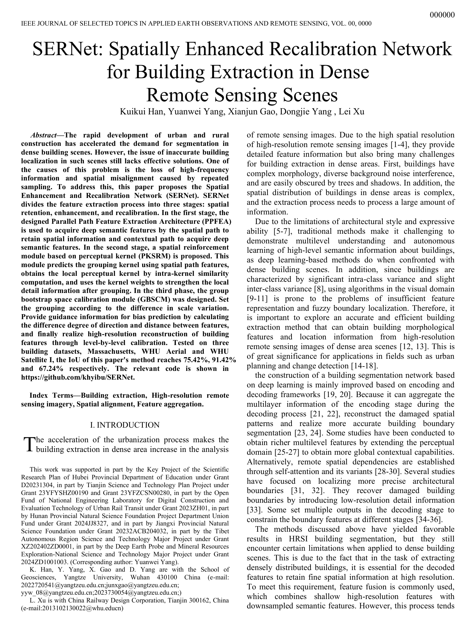 研究生韩奎奎以第一作者身份在SCI二区期刊《IEEE Journal of Selected Topics in Applied Earth Observations and Remote Sensing》上发表题为“SERNet: Spatially Enhanced Recalibration Network for Building Extraction in Dense Remote Sensing Scenes”的研究论文,其中嘟嘟成人网