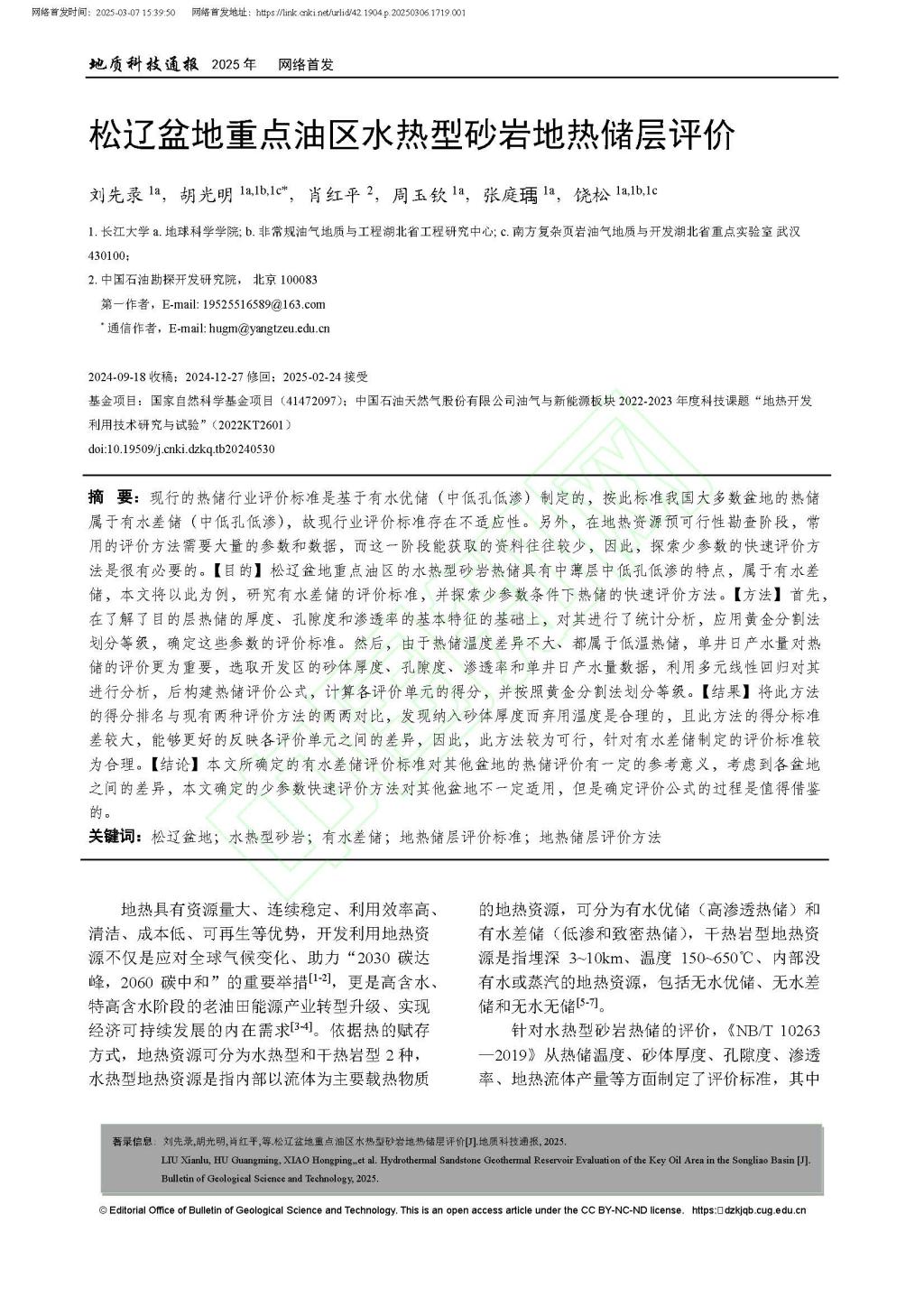 地科院硕士生刘先录在胡光明教授的指导下,在期刊《地质科技通报》上发表题为“松辽盆地重点油区水热型砂岩地热储层评价”的研究论文,嘟嘟成人网