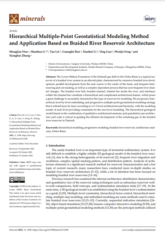 博士生窦梦皎在《Minerals》上发表题为“Hierarchical Multiple-Point Geostatistical Modeling MethodAndApplication BasedOnBraided River ReservoirArchitecture”的研究论文。嘟嘟成人网