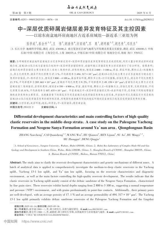 23级研究生张学成以第一作者身份在中文EI检索期刊《石油与天然气地质》上发表了题为“中-深层优质碎屑岩储层差异发育特征及其主控因素——以琼东南盆地环崖南地区古近系崖城组—新近系三亚组为例”的研究论文,嘟嘟成人网
