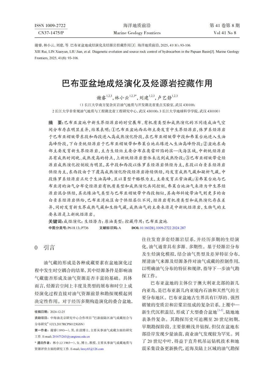 师生,研究生谢睿为论文第一作者,其导师林小云教授为通信作者。论文重点讨论了巴布亚盆地的烃源岩发育特征、热演化特征及其对油气分布的控制作用。