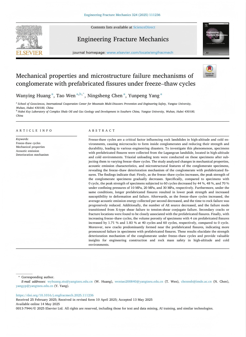 2023级研究生黄婉滢在中科院大类2区SCI期刊《Engineering Fracture Mechanics》上发表题为“Mechanical properties and microstructure failure mechanisms of conglomerate with prefabricated fissures under freeze–thaw cycles”的研究论文(图1)。嘟嘟成人网