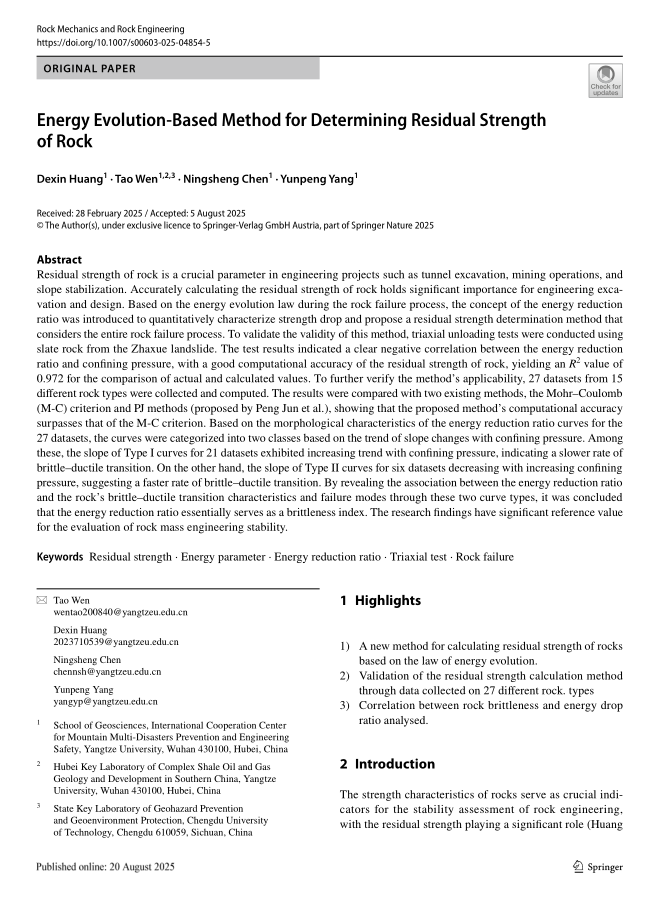 2023级研究生黄德昕在期刊《Rock Mechanics and Rock Engineering》(最新影响因子为6.6,位列JCR分区一区,中科院大类一区)上发表论文“Energy Evolution-Based Method for Determining Residual Strength of Rock”。嘟嘟成人网