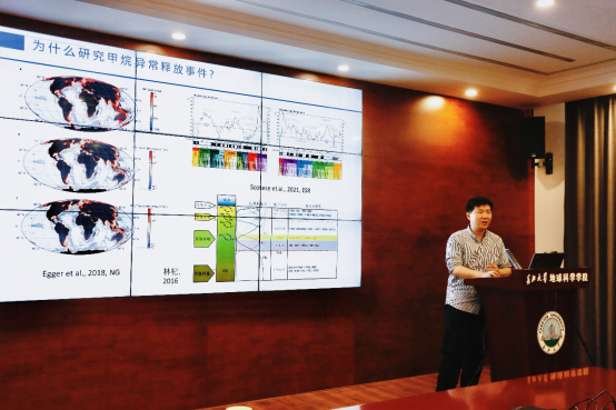 青年教师陈粲特任教授以《海洋甲烷事件与黑色页岩》为题,讲述了古海洋甲烷异常释放事件的气候、环境效应和其与黑色页岩之间的联系。并通过将今论古的研究思路,探讨了古海洋甲烷异常释放事件重建方法。讲座主要围绕印度洋安达曼海和我国南海神狐海域水合物站位的黄铁矿微量元素、粒径、硫同位素、镍同位素等,建立甲烷释放识别标志,并在深时地球甲烷频繁释放的华南埃迪卡拉系陡山沱组进行运用,证实了黄铁矿微量元素作为甲烷异常释放事件指标的可靠性,进一步探讨和展望了甲烷事件未来的潜在研究趋势。会后,现场的与会师生就碳、硫、镍同位素分馏机理进行了进一步深入的交流。