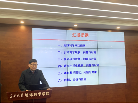 历史悠久,基础较好,希望学院领导班子一是要有危机意识,以万变应万变,要进一步找准发展定位,适应新时代发展要求;二是要明确发展目标,加强学科建设,高度重视国家基金申报工作,要为实现学校基金倍增计划做出地科贡献;三是要加大高水平人才引育工作,做到激励与约束并重,加快高质量科研成果培育,促进高水平团队建设;四是要牢牢树立培养拔尖人才与国际化人才的思想,要鼓励老师走进学生,多与学生谈心,要快速推进地质资源与地质工程学科建设;五是要加快平台建设提档升级,重新谋划重点研究方向,争取突破一批学科前沿研究成果和关键技术领域。