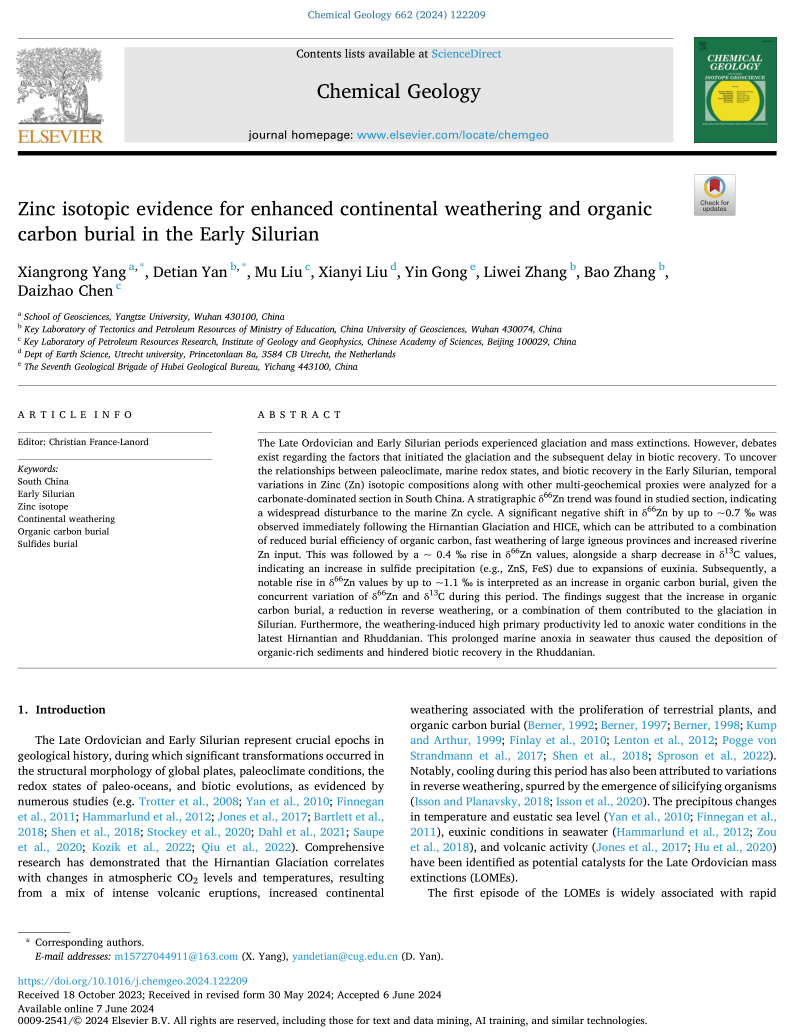 地质系教师杨向荣在地学TOP期刊《Chemical Geology》上发表题为“Zinc isotopic evidence for enhanced continental weathering and organic carbon burial in the Early Silurian”的研究论文。