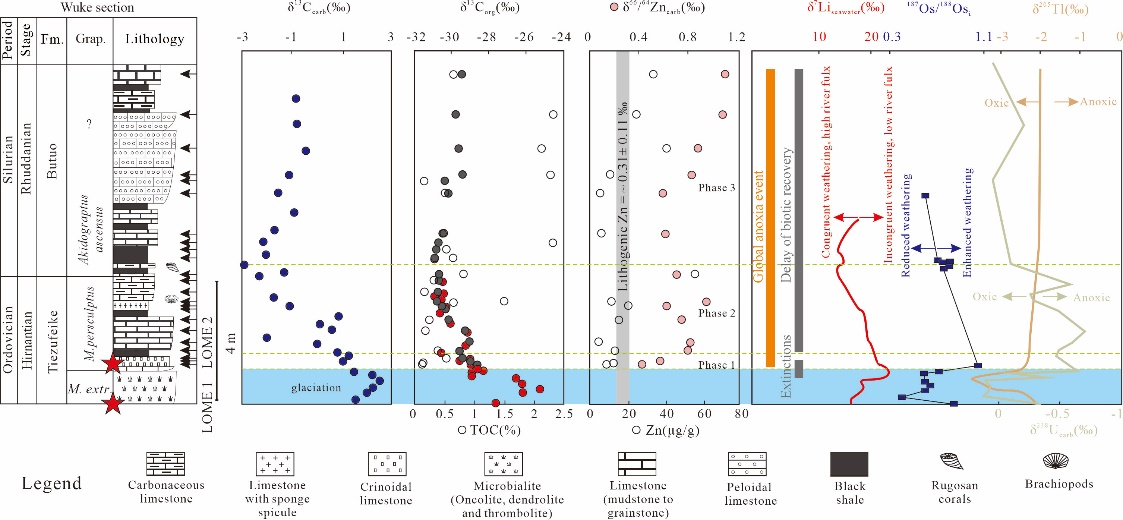 本次研究认为晚奥陶世赫南特晚期全球硫化水体面积的扩张导致了晚奥陶世第二幕生物灭绝事件的发生,鲁丹期全球大陆风化作用驱动的海洋水体持续缺氧不仅抑制了早志留世生物的复苏,并促进了有机碳的埋藏和华南龙马溪组富有机质页岩(页岩气开发重要层位)的沉积。此外,早志留世强烈的大陆风化作用和减弱的反风化作用均降低了大气二氧化碳浓度,共同促进了该时期冰室气候的形成。总之,本次研究基于碳酸盐岩锌同位素证据重建了早志留世全球海洋锌同位素组成,不仅揭示了早志留世这一重要地质历史时期大陆风化作用、海洋水体缺氧、生物复苏的协同演化过程,同时也为华南页岩气重要烃源岩(下志留统龙马溪组)的广泛沉积机制提供了关键证据(图4)。